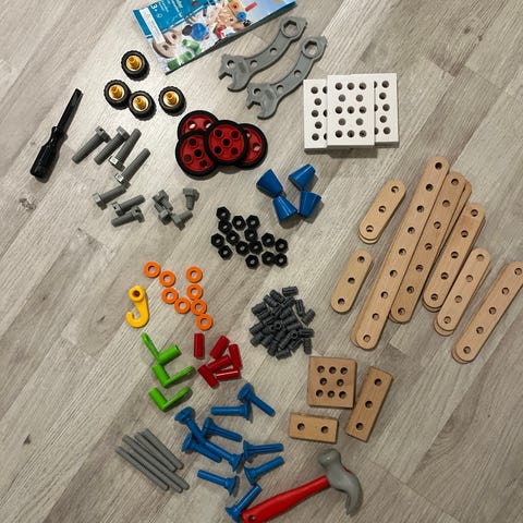 Mukana vasara ja paljon nauloja. Sinisessä puuosassa kulumaa maalissa. Muut osat uudenveroisia. Tällä ikää n. 25 vuotta.