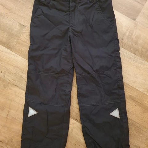Hyväkuntoiset ruskeat Reimatec välikausihousut koko 104 cm ja tummansiniset olkaimelliset Travalle ohuet toppahousut koko 110 cm. Aavistuksen verran kulumaa polvessa, mutta ehjät ja hyvin kosteutta kestävät.