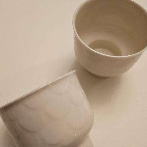 Tuotannossa 70-luvulla. Korkeus 8cm ja leveys 8,5cm. Valkoinen.