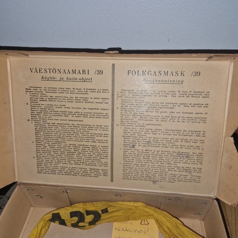 Väestönsuoja kaasunaamari muovisessa säilytyslaatikossa.