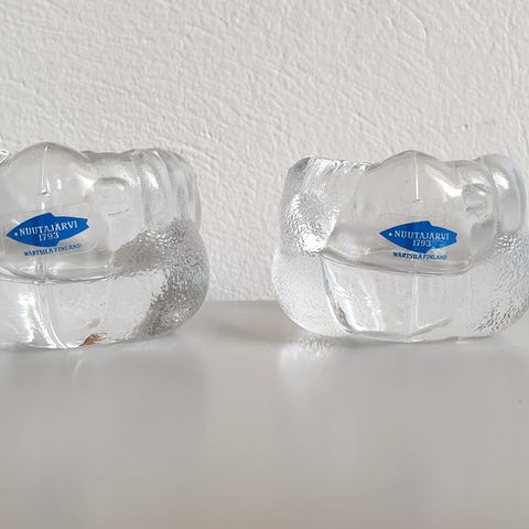 Korkeus 4,5 cm, halkaisija 5,5 cm. Valmistaja Nuutajärven Lasi, suunnittelija Kerttu Nurminen. Tuotannossa 1977-1985. Siistissä kunnossa, ehjät, ei tarraa. Yhteishinta kolmesta 10 €.