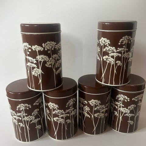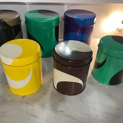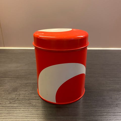 2 aarikan kannellista peltipurkkia, halkaisija 11cm ja korkeus 13cm. Toinen erittäin hyväkuntoinen, toisen kannessa kulumaa (kts. kuva). Ilmeisestikin n. 1960/-70 lukujen taitteesta. Helsingissä, Laajasalossa.