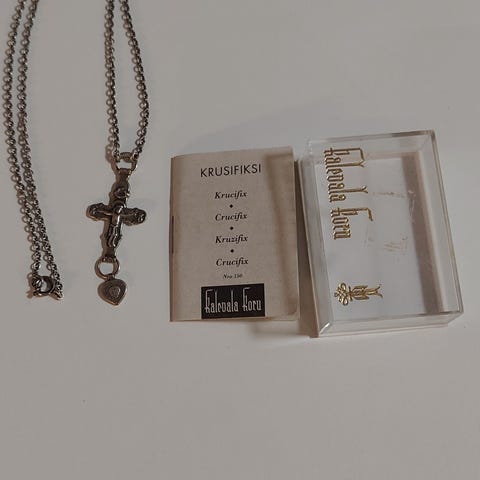 Kalevala korun iso Räisälän krusifiksi. Kuvan mukaisessa kunnossa. Ketju puuttuu. Takana kaiverrettu päivämäärä. 916 Hopeaa.