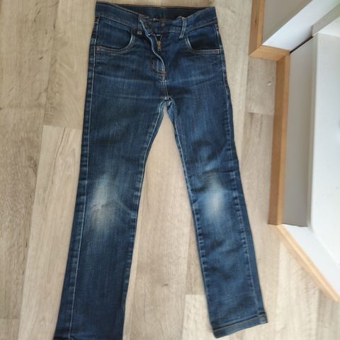 Myydään siniset farkut edessä ja takana taskut. Säädettävä kuminauha. Koko 116/122. Edessä koristenappi. Merkki Bogi
