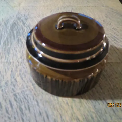 Arabia Pata ruskeassa värissä. Kulho ja lautanen ovat valmistettu kestävästä keramiikasta. Tuotteiden pohjassa näkyy valmistajan merkintä. Soveltuvat arkeen ja keräilyyn. Käytetty pata, kannesta puuttuu pikku pala, leimakin on osittain tallella
