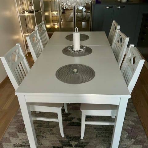 Myytävänä käytetyt: jatkettava ruokapöytä (pituus- 140cm+40cm, leveys-95cm, korkeus-75cm) ja tuolit 4 kpl (puuta ja tekonahkaa). Maksuehto: käteinen. Toimitus: 30e (pääkaupunkiseudulla).