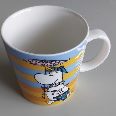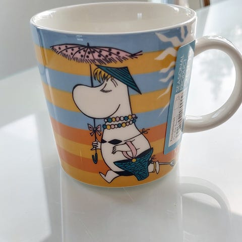 Uusi, käyttämätön muumimuki-rantaelämää 2008. Ollut vitriinissä.