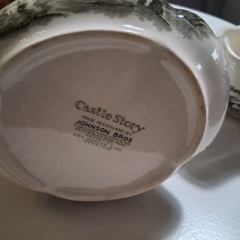 Kuppi ja lautanen. Merkki: Castle story. Kupissa ja lautasessa linna-aihe. Kupin mitat: 9 x 11,5cm. Lautasen halkaisija: 17,5cm. (Nouto tai postituskulut lisätään hintaan).
