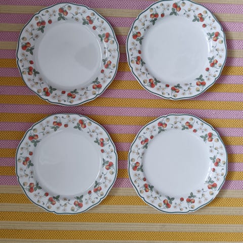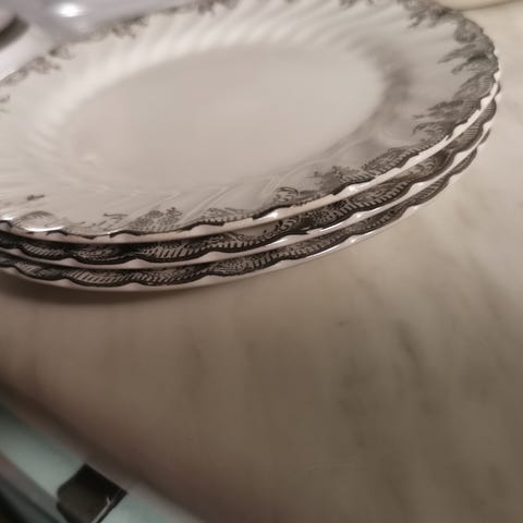 VERITABLE PORCELAINE. Ranskalainen posliini. 6 lautasta metsästystyylillä: 5 ruokalautasta ja 1 tarjoiluvati, joissa on kultareunus ja pitsimäinen reuna. Kaikki ovat erinomaisessa kunnossa, ilman lohkeamia. Lautasten halkaisija on 24 cm, vadin 35 cm.