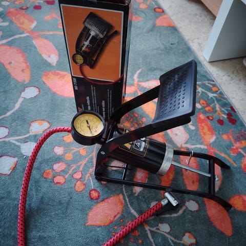 Myydään jalkapumppu varustettu painemittarilla max. 10 bar. Paineletku 70 cm ja lukitus venttiiliin. Vähän käytetty mm. piilopirtillä kottikärrin renkaan täyttöön (Ei sähköä) Hp. 10 euroa Ylitorniolla