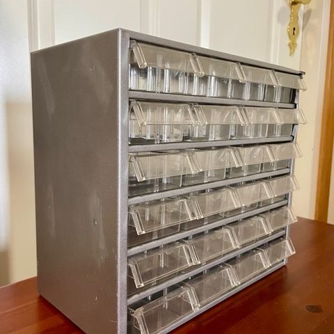 Iän myötä ajan patinaa ottanut neljä laatikollinen arkistolaatikosto.