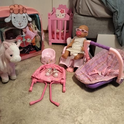 Tämä ollut yli kymmenen vuotta sitten leikeissä. Nyt varastossa, siisti yleisilme. Koko sellainen leikkinuken koko arviolta n. 50x30x25. Mmm