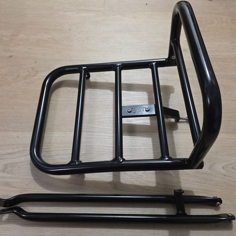 Iso ja alumiininen pakettiteline, jossa myös sivutuet. Kaunis Ruotsalainen design.