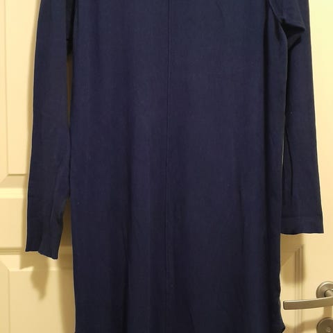 Ihana musta ohut neulemekko, materiaali villan ja puuvillan sekoitusta. Kivat pyöreät taskut ja pienet halkiot helmassa, selässä vekkiyksityiskohta. Miellyttävä päällä, ja väri tosiaan musta vaikka kuvissa paikoitellen vääristyy. Kuvissa pesun jäljiltä rypyssä.