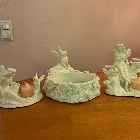 Partylite Arianan Puutarha posliinisomiste, johon sopii kaksi tuikkivaa ja votiivi. Huurrettu votiivilasi mukana. Korkeus 20 cm, leveys 18 cm, syvyys 19 cm