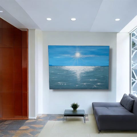 Kaunis ranta , Meriaiheinen taulu. Pieni purjevene kaukana. Kauniit värit. Öljy, kangas.