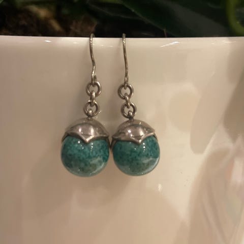 Hopeiset Tintti korvikset pieni pallo 13 mm, pohjaväri tumma sininen vihreällä marmorikuviolla, leima kk, tarkistettu hopeaksi. Hieno kunto, hyvin vähäisellä käytöllä olleet.