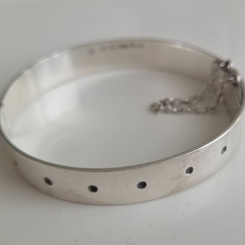 Hopeinen rannekoru nro 208. Vuosileima M7 = 1965. Koko 6,5 x 5,7 cm, sisämitta n. 19 cm, leveys päältä 2 cm. Suunnittelija Holger Lindström. Hienokuntoinen koru.