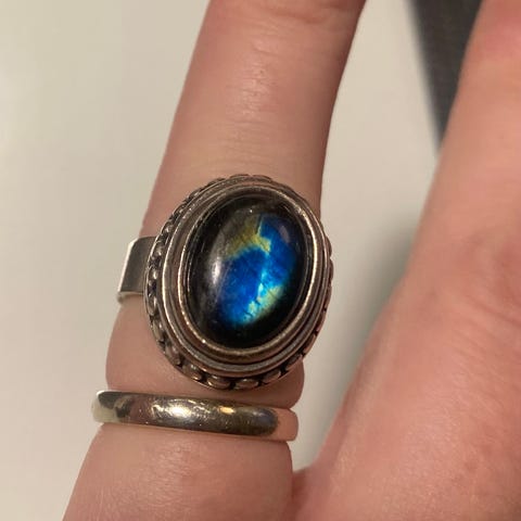 Hopeinen Börje Rajalinin sormus nro 770. Kivi ilmeisesti ruusukvartsi, joka valosta riippuen näyttää harmahtavalta. Koko 16 mm, leima kk 925. Hienokuntoinen.