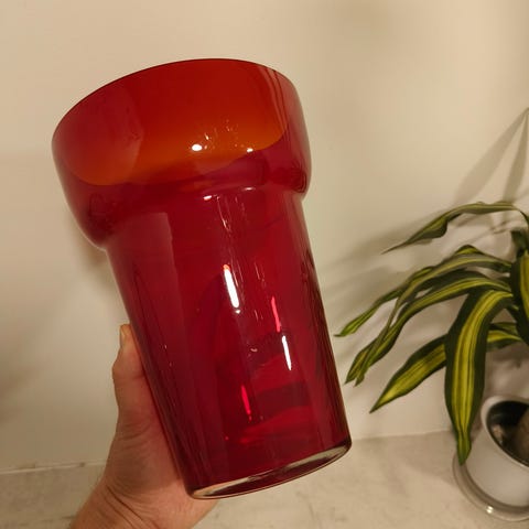 Vihreä lasimalja tai maljakko.Muistuttaa kovasti Riihimäen lasin hyrrää.Mutta suuaukko on erilainen.Nouto Hämeenlinnasta.
