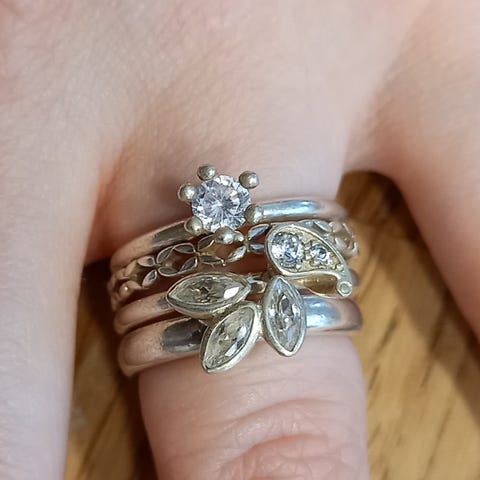 Näyttävä hopeinen sormus kirkkaalla kivillä. Kiviä kolmessa rivissä, etuosan leveys 8 mm.