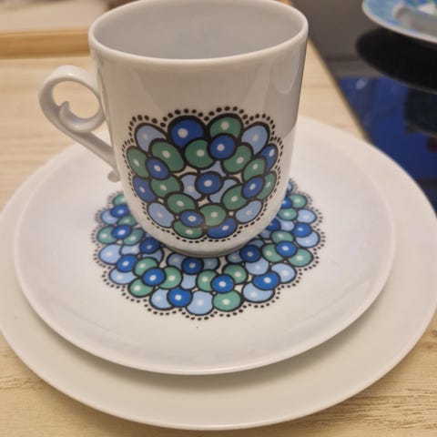 Oikein tarkalle ostajalle tiedoksi: Muutama valmistusvaiheessa tullut jälki: epätasaisuutta lautasen pinnassa, pari tummaa pistettä lasitteen alla (lautanen ja kuppi). Yhdessä lautasessa erilainen leima kuin muissa.