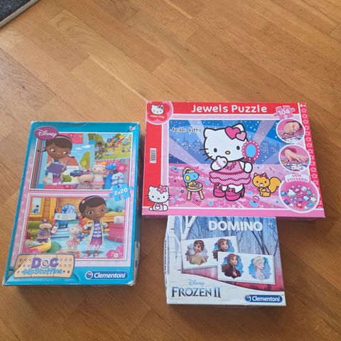 Samassa laatikossa Memo, Domino, Puzzle 2 kpl palapeliä. Laatikko on särkynyt.