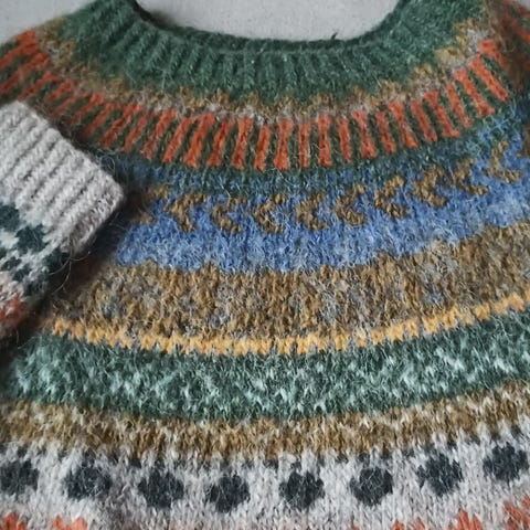 Uudenveroinen paksusta islanninvillasta neulottu neule. Koko s/m halutusta väljyydestä riippuen. Kainalo-Kainaloon 48cm ja kainalo-hiha 54cm. Väri vaaleanpunainen ja raidat turkoosin vihreät.