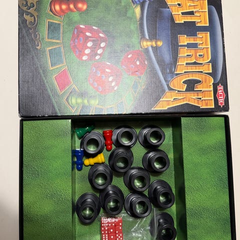 Pelilauta, erikoisnoppa, kaikki nappulat ja ohjekirja ovat tallessa.