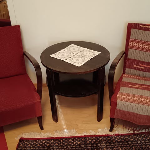 Myydään kuvanmukaiset 40-50-luvun nojatuolit ja niihin kuuluva pieni pöytä, tuolin istuin osat vaativat kunnostuksen, tuolien ja pöydän puupinnat käsitelty -90-luvulla ammatilaisen toimesta, hintaan 150e ja vain haku Joensuusta ja viimeisessä kuvassa olevan tuolin saa halutessaan kaupanpäälle se vaatii myös verhoilun ja käsinojan korjauksen.