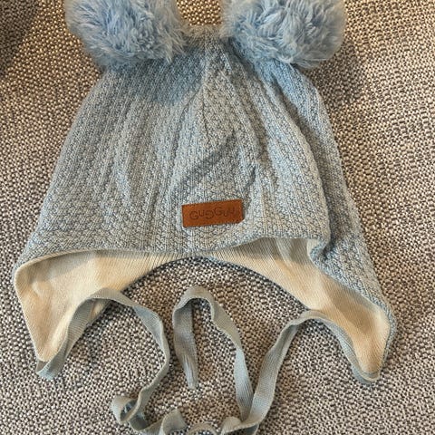 Gugguu merinovillainen pipo kahdella tupsulla ja sidottavalla nauhalla sekä tupsullinen kaulahuivi joka on myös merinoa.
