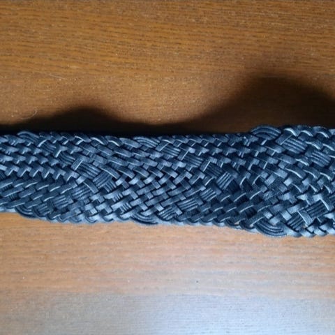 Käyttämätön punottu vyö. Koko pituus n. 100 cm, leveys 4,5 cm. Ei vyönreikiä koska solki lävistää punonnasta mistä kohdasta vaan. Väri hyvin tumma ruskea.