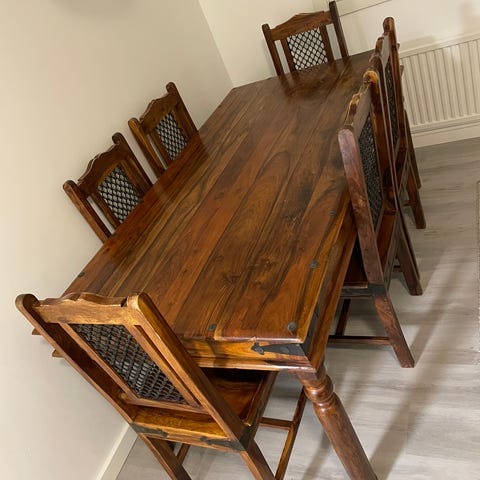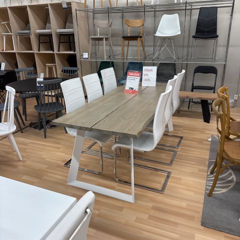 Pakettiin kuuluu pöytä 90cm x 180cm, päädyn jatko 50cm ja kuusi tuolia.