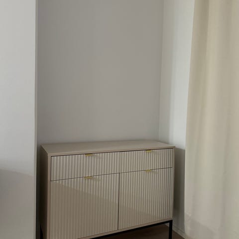 Kaksi vetolaatikkoa vaimentimella, metalli jalat ja lasinen päälilevy.