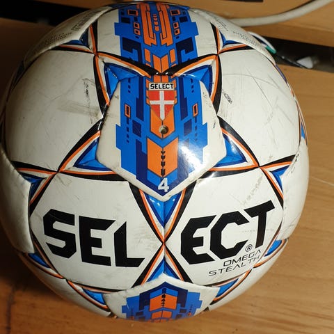 Vielä ihan käyttökelpoinen pallo. Koko 4. Vanhat omistajamerkinnät tussitettu yli.