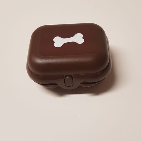 Vaalean sininen, läpinäkyvää muovia, siisti eväsrasia