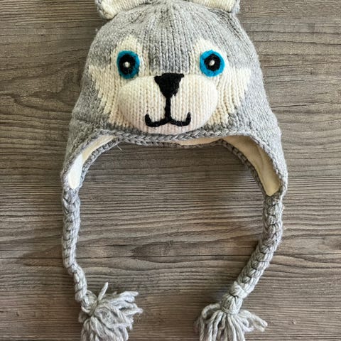 Myydään uudenveroinen lasten Husky hattu, käytetty pari kertaa, materiaali 100% merinovilla ja sisällä fleece-vuori. Sopii alakouluikäisille.