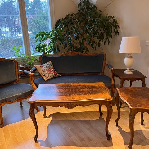 Rokokoo sohva, isännän tuoli, emännän tuoli ja pöytä
