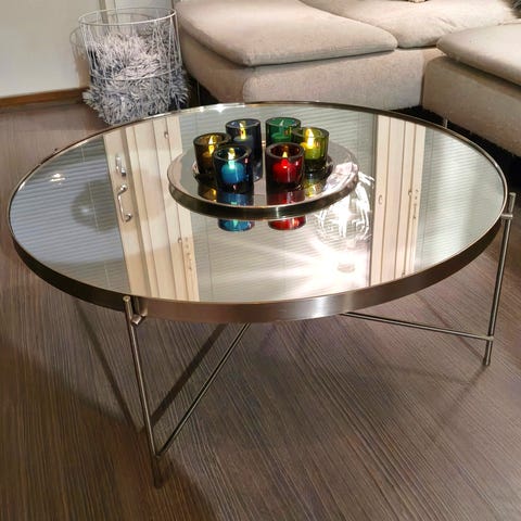 Myydään kuvanmukainen peili sohvapöytä. Halkaisija 62,5cm ja korkeus 38cm.