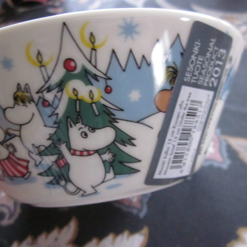 Uusi, käyttämätön, tarrallinen muumikulho-talviuni 2015. Ollut vitriinissä.