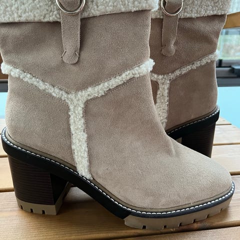 Käyttämättömät polven yli -mittaiset mustat mokkanahkaiset naisten talvisaappaat, uudenveroiset. Koko 42 ja merkki Kolme60. Saappaat on valmistettu mokkanahasta ja vuori on lampaanvillaa.