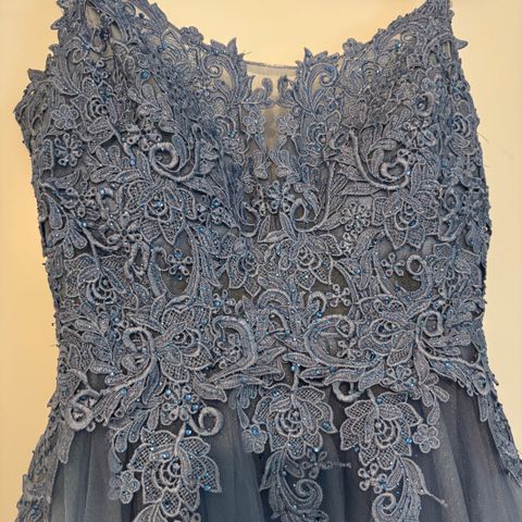 Kaunis yönsininen kirjailtu juhlamekko hartiahuivilla. Pituus kainalo - helma 129 cm. Rinnanympärys 90cm, vyötärö 76cm, huivi 48 x 200cm. Mekossa on alusmekko. Voi tulla sovittamaan.