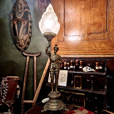 Tämä harvinaisen upea valaisin on alun perin härkäkärryjen pyörän napa Itä-Aasiasta, joka on muutettu näyttäväksi valaisimeksi. Valaisimen rungon ja varjostimen yhdistävä sylinteri on erittäin painava (varmaan 25 kiloa) ja siihen on käsin veistetty "säleikkö", joka tekee valaisimelle "lyhtyvaikutelman". Härkäkärryjen sylinterissä käytetty puu (eeben/tiikki) on arvioitu olevan 1800-luvun puolelta, sähköistys on tehty myöhemmin. Valaisin on ostettu arvohuutokaupasta ja hinnat ovat olleet vain nousussa. Todella upealla historialla varustettu uniikki kohde, joka sopii tunnelmanluojaksi monenlaiseen sisustukseen.