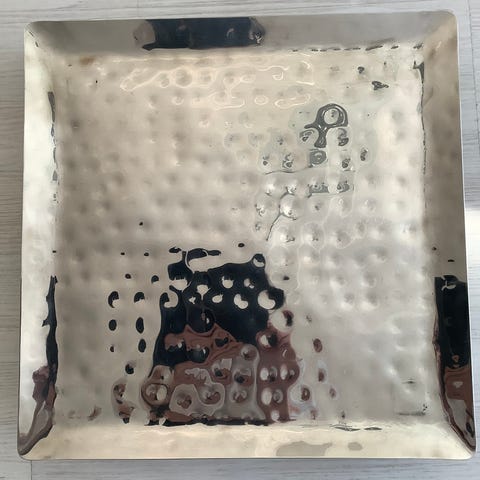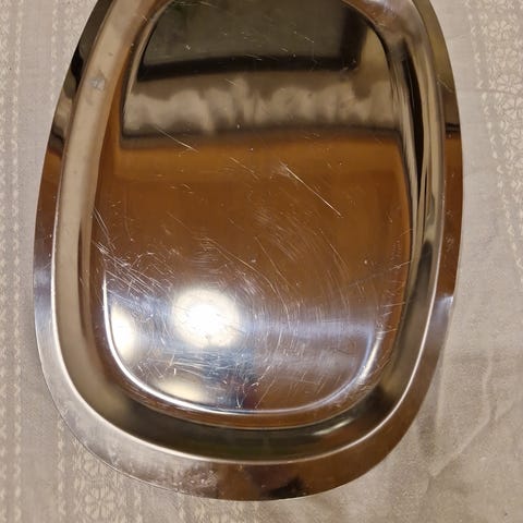 Tottakai kun on ollut käytössä, niin hyvin pienehköjä viiruja. Lisäkuvia pyydettäessä. Vankka ja pitkää käyttöä kestävä teräksinen tarjoiluvati.