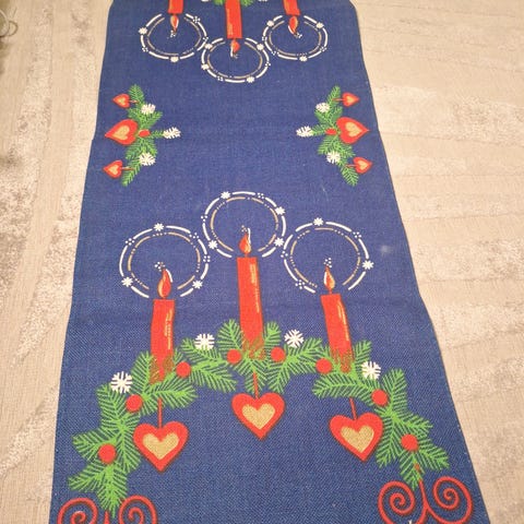 Vanha kynttiläkuvioinen juuttikankainen joululiina. Liinan koko on noin 49 cm x 28,5 cm. Oikein hyvässä kunnossa, mutta kaipaa ehkä silitystä.