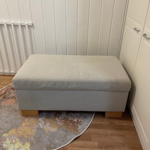 Myynnissä hyväkuntoinen harmaa rahi. Taloudessa ei tupakointia eikä eläimiä. Koko 100x100x35cm.” Pohjaan voi kiinnittää jalat (ei kuulu kauppaan).