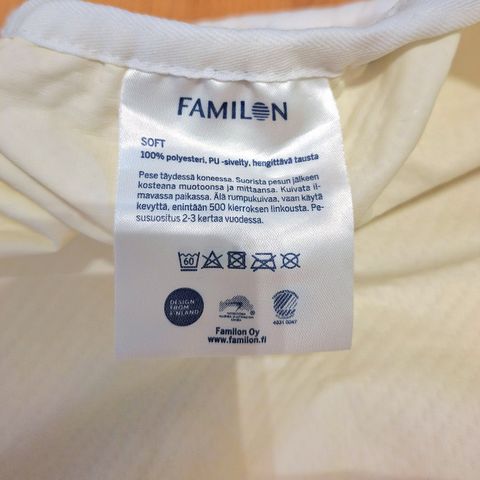Ulkokerros untuvaa, sisäkerros höyhentä, pesu 60 astetta.