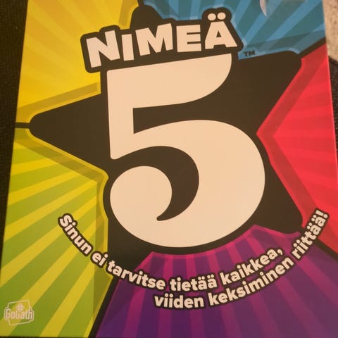 Nimeä 5 Lautapeli Osaatko nimetä viisi asiaa, jotka voivat saada ihmisen aivastamaan? Nimeä 5 on hauska partypelin ja tietopelin yhdistelmä, jossa pelaajien pitää nimetä viisi asiaa annetusta kategoriasta. Kuulostaa helpommalta kuin onkaan, sillä vastaukset pitää nimetä 30 sekunnissa! Ikäsuositus: 12+ Pelaajamäärä: 2+