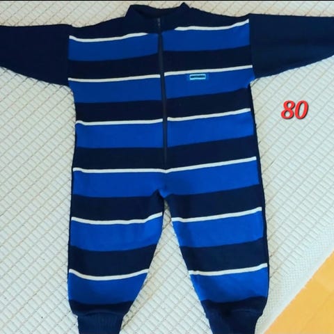 100% villaa, lämmin haalari. Kokomerkintä 90, mutta kutistunut pesussa ja vastaa noin kokoa 80. Kaksi reikää etupuolella (lisäkuvat), eivät ole käytössä kasvaneet ja helppo paikata niin halutessaan.
