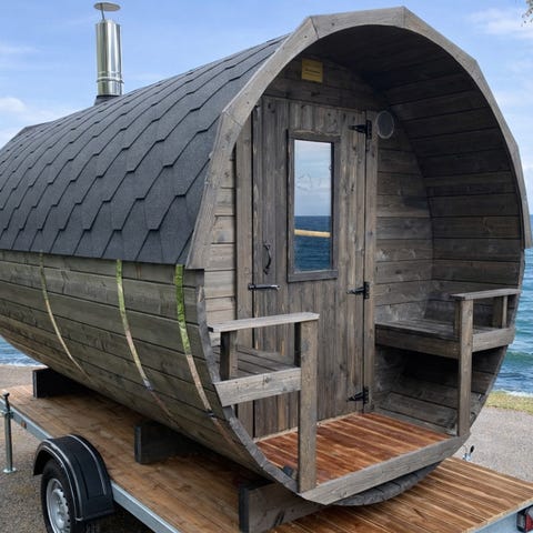 Täydellinen toimitus! Kevyt peräkärrysauna, tynnyrisauna